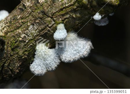 太い朽木の幹に白くモフモフ毛むくじゃらなスエヒロタケキノコ群(自然環境下ストロボ+マクロ接写)