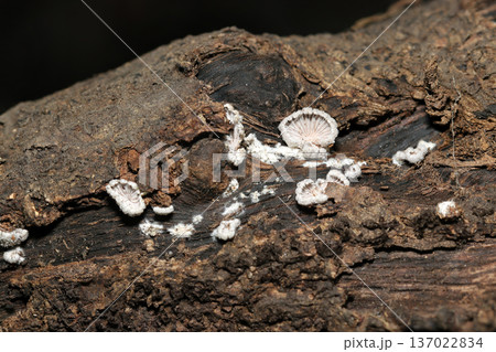 暗い倒木背景に鮮明な白いスエヒロタケが自生しているマクロ接写画像。
