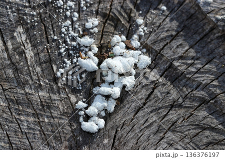 枯れた切り株に白いスエヒロタケ茸の幼菌(自然環境下菌・キノコ類マクロ撮影)