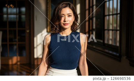 高級住宅の窓辺で凛とした表情の日本人女性を撮影