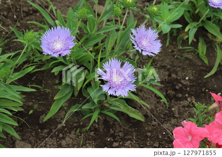 初夏の公園の花壇に咲くストケシアの紫色の花