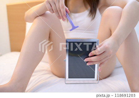T字カミソリを持つ下着の女性の下半身 ムダ毛処理 ケア 医療美容脱毛 除毛 下腹部