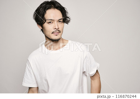 髪を触るアジア系(日本人)男性 爽やかな脱毛やスキンケアのイメージ カメラ目線