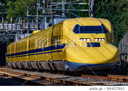 秋の京都市内を行く東海道新幹線ドクターイエロー
