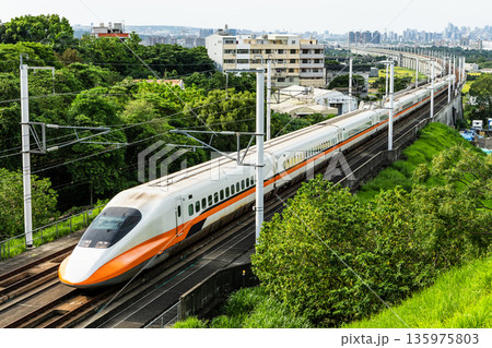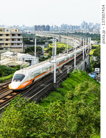 市街地を背景にカーブを曲がり走る台湾新幹線(台灣高鐵)