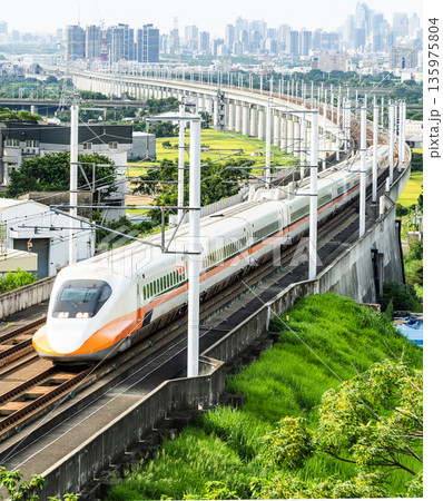 Overlooking view of the Taiwan High Speed Rail Painted trains passing the Waipu of Taichung in Taiwan, It is the only high-speed railway in Taiwan.