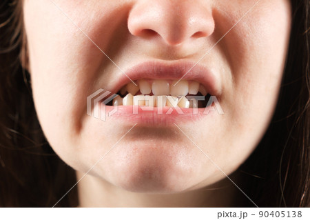 Patient with malocclusion, gap between upper and lower teeth, close-up mouth.