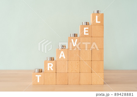 旅行のイメージ|「TRAVEL」と書かれた積み木とコイン