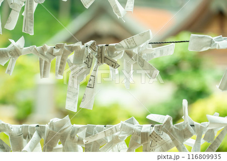 岐阜県揖斐川町 新緑の谷汲山華厳寺にあるおみくじを結んだおみくじかけ