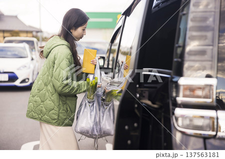 スーパーの駐車場で買ってきた荷物を車に入れる女性