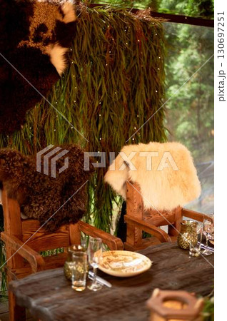 Two thrones for the wedding couple, in the Viking style. Heavy wooden tables and chairs decorated with animal skins and greenery. Massive composition