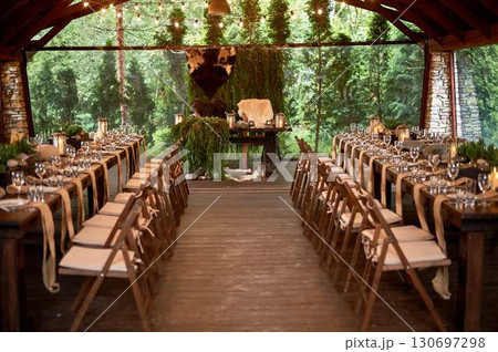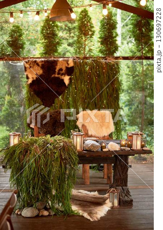A large terrace for a wedding and banquet in a rustic style. Thrones and skins. Stylized as Vikings. Dark wood. A lot of greenery.