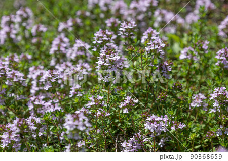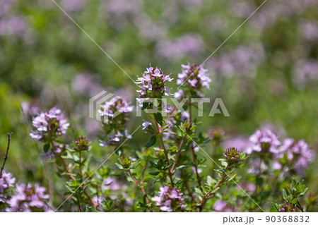 Fresh aromatic Thyme vulgaris plant with small purple flowers growing in garden, closeup