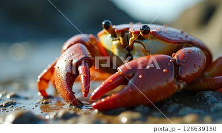 Wet Red Crab on Coastal Rock with Sharp Claw Detail in Sunlight