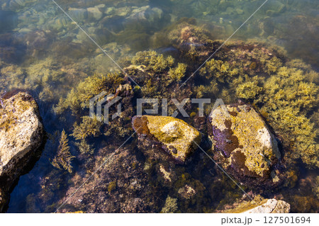 Clear coastal water with submerged algae and colorful rocks. Marine textures, biodiversity, and natural coastal ecosystem