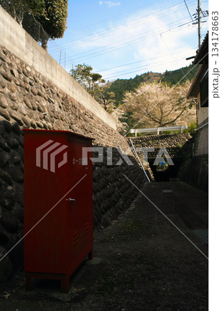 石垣の消防ホース格納庫と桜