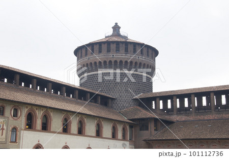 Travel to Italy - courtyard of fortress Castello Sforzesco (Sforza Castle) with towers Torre del Filarete and Torrione di Santo Spirito in Milan city