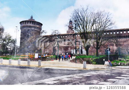 ミラノにあるスフォルツェスコ城のカルミネ門から入っていく多くの観光客(オリジナル画像からAI生成)