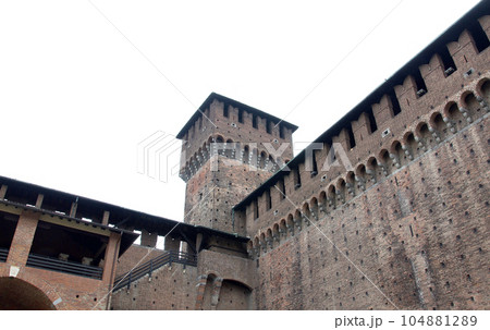 イタリア北部にある都市、ミラノにある城塞のスフォルツェスコ城。レンガ積みの城壁と塔が美しい。