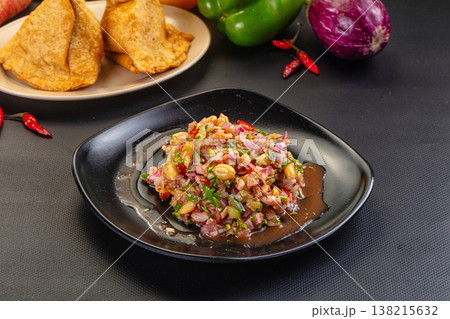 Spicy peanut and red onion salsa with cilantro and chili, served with fried chips.