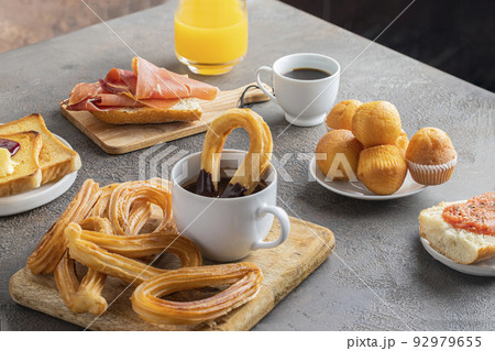Natural light. Spanish desayuno. Churros, pan con tomate and manchego cheese in plate. Menu design. Top view.