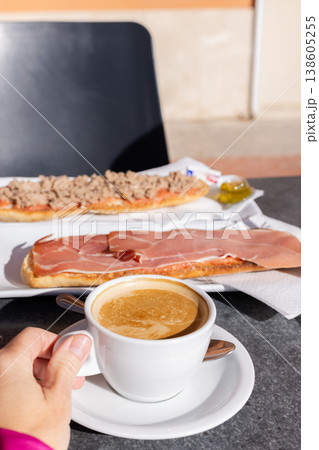 Coffee with milk and tostadas with tuna and ham. Spanish breakfast in a cafe outside.