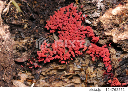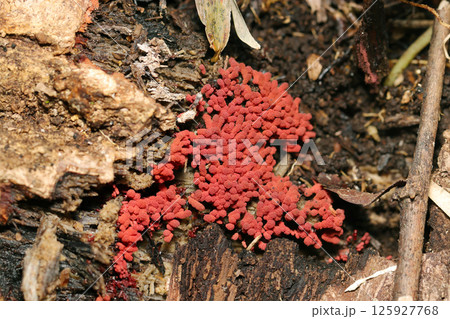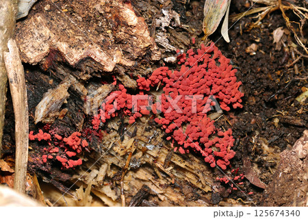 朽木の間に赤煉瓦色の小さな毛玉集合体のようなウツボホコリ茸(自然環境下マクロ撮