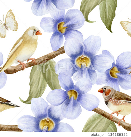 Watercolor songbirds on blooming garden vine flowers seamless pattern on white. Pastel purple blossom of Thunbergia climbing liana plant for spring floral designs with pastel beige butterflies