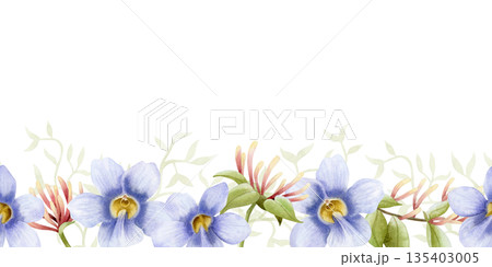Botanical garden flowers watercolor seamless border. Spring tropical blossom of honeysuckle and thunbergia in pastel purple repeat horizontal banner. Climbing liana for summer nature floral design