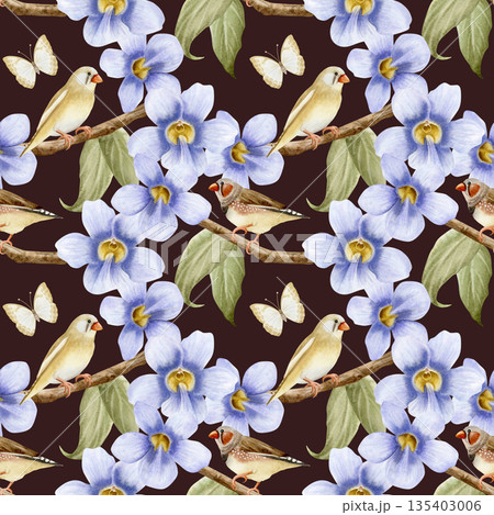 Night garden nature watercolor seamless pattern on dark brown. Tropical pastel purple flowers with vine and birds on hedge repeat background. Thunbergia climbing liana plant for spring floral designs