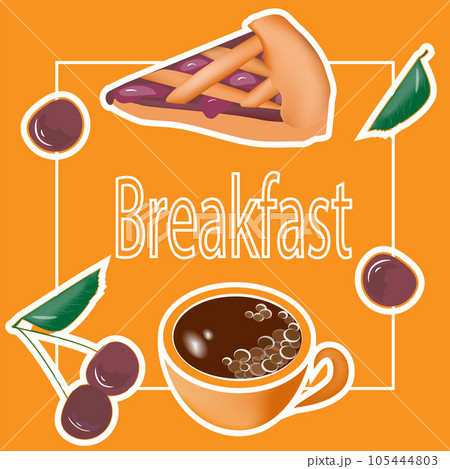 vector background cherry pie a cup of coffee on an orange background tasty breakfast