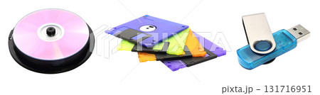 Set of vintage data storage including floppy disk, CD, and USB flash drive isolated on transparent background