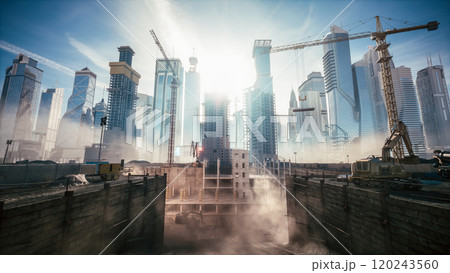 Construction of a modern city. Large construction site against the backdrop of modern skyscrapers. Construction site at sunrise