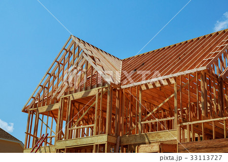 The timber frame beam framework house stick built home under construction new build with wooden truss