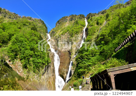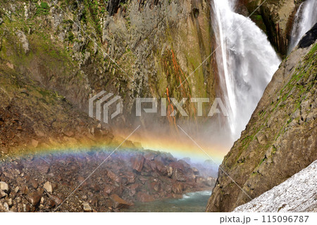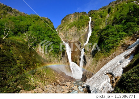 【富山県_称名滝_ハンノキ滝】新緑の中、名瀑がV字形成し虹の架け橋を作る見事な景観が出現
