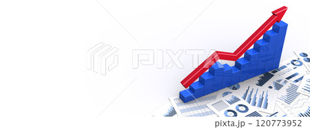V字回復する3Dの矢印と棒グラフとビジネス資料