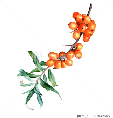 Sea buckthorn orange berry branch with leaves. Hand drawn botanical watercolor illustration isolated on white background. For clip art cards menu label package