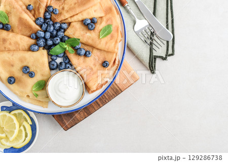 Homemade thin pancakes (crepes) with fresh blueberries and sour cream