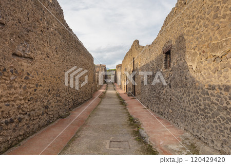 Ancient ruins of Pompei city, Naples, Italy. View of ancient street of Pompeii, Pompei is ancient Roman city destroyed from eruption of Mount Vesuvius in 1st century, Naples, Italy