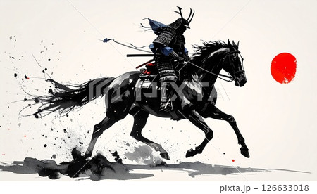 水墨画で描かれた馬上の侍の人物画