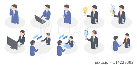問い合わせから契約までのビジネスシーンのアイソメトリックイラストセット