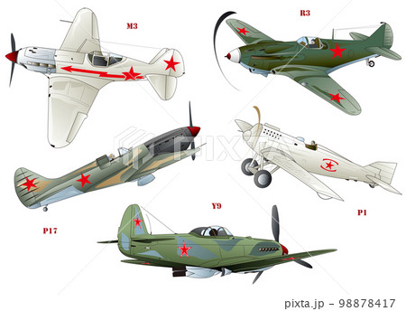 第二次世界大戦頃に活躍したロシアの単座プロペラ戦闘機5種類vectorイラストセット。