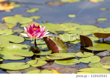 池の水面に咲くピンクの睡蓮