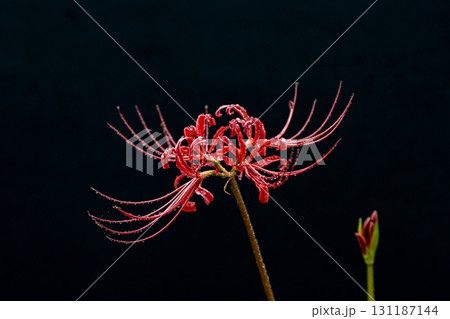 雫をまとった彼岸花のクローズアップと黒い背景