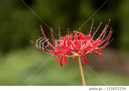 雨上がりの秋の野原、水滴をまとった彼岸花