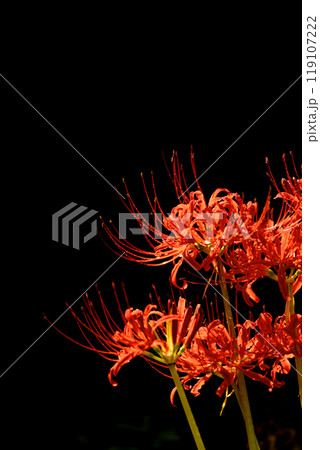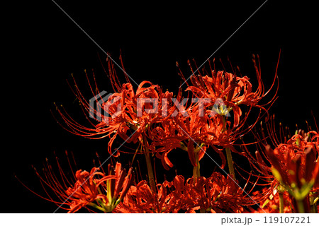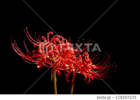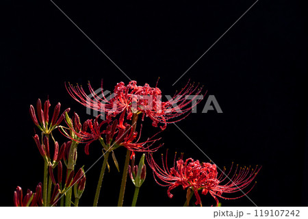 雨上がりの水滴をまとう彼岸花と黒い背景