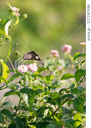 ピンクの野花の間を舞う黒い蝶と緑の自然風景