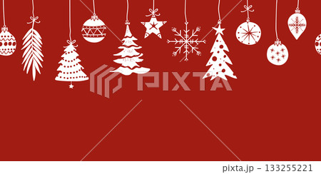 Christmas border seamless pattern with cute festive decorations on a plain red background with copy-space for text.