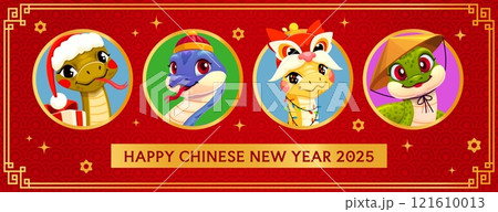 Chinese lunar new snake year banner. Vector Asian Cny 2025 holiday collage with reptile characters in festive attire including conical, Santa and lion dance hats, within round frames on red background