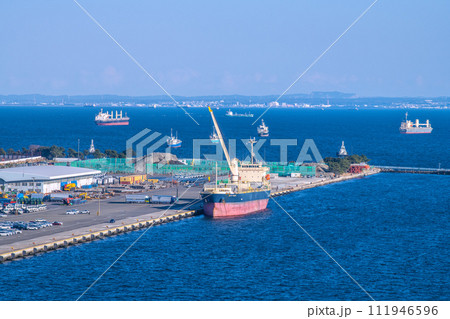 日本の横浜都市景観 大黒ふ頭・T-8号上屋や貨物船、大黒海釣り公園などを望む(奥は千葉)